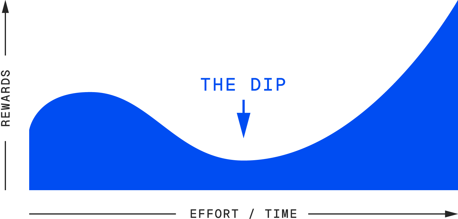 Anything worth doing has a dip. It’s the long, often frustrating gap between starting something and becoming great at it. When you hit The Dip, you have to decide: push through, or quit? Most people quit. That means The Dip is a gatekeeper. It creates scarcity, and scarcity creates value. It’s worth more if no one’s doing it.