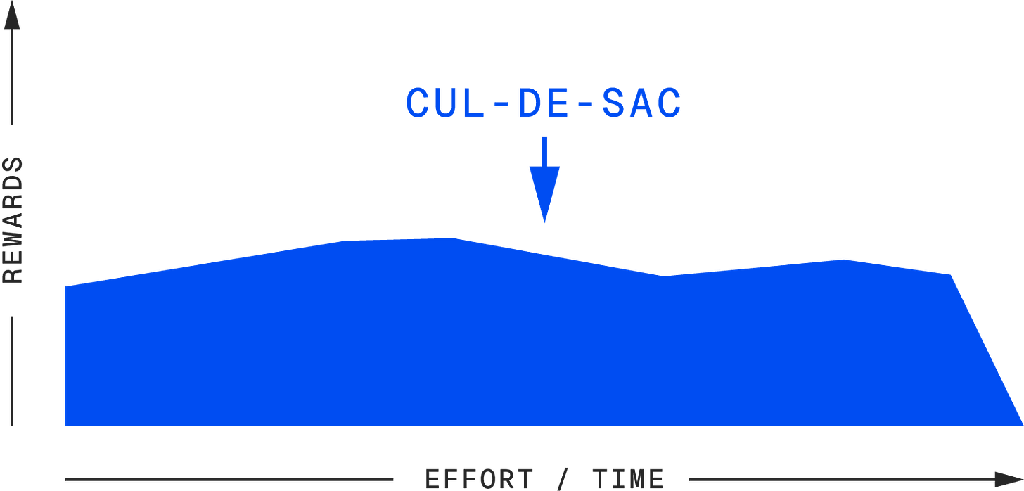 A cul-de-sac is a dead-end. You’re putting in effort, but no matter what you do, things just won’t get better. It’s not going to lead anywhere meaningful, no matter how hard you try. Maybe you’re in a job that has no room for growth, or pursuing a hobby that doesn’t light you up anymore. In this case, you’re not in a dip; you’re in a cul-de-sac. And the worst part? A cul-de-sac can be comfortable. You can keep plodding along, making just enough progress to justify sticking with it, but deep down, you know it’s not going anywhere. That’s why quitting a cul-de-sac is crucial. It frees up your time and energy to focus on something with real potential.