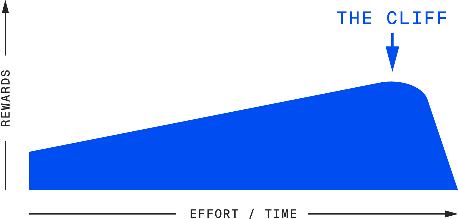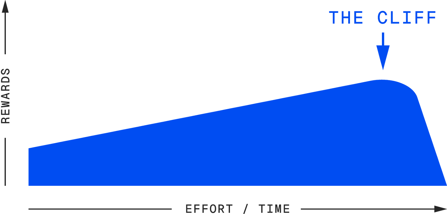 Then there’s the cliff. A cliff feels exciting at first, but the further you go, the worse it gets—until you hit a point where you’re in free-fall. Imagine a career path that starts out full of promise, but eventually leads to burnout or exhaustion. Cliffs are dangerous because they often disguise themselves as opportunities, and by the time you realise it’s a cliff, you’ve invested too much. Quitting at the right time here isn’t just smart, it’s necessary. The longer you hang on, the more it costs you (in time, energy, or your mental health).