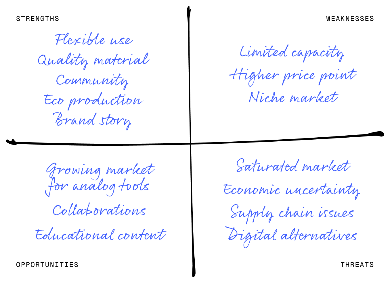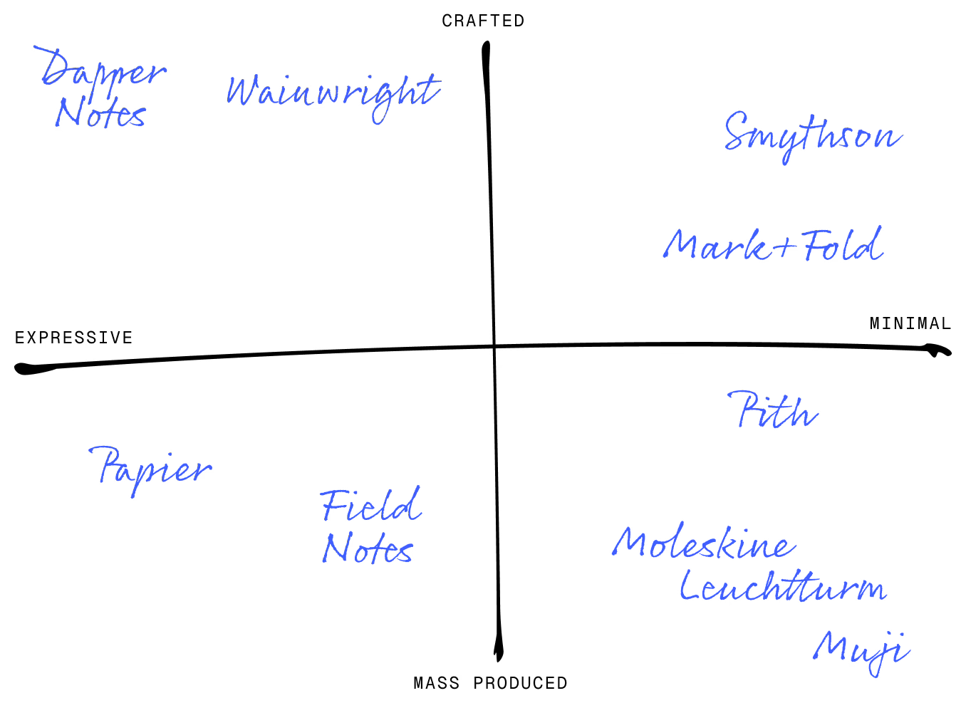 Obviously you can’t fit every brand on here, but including the ones that stand out to you should be enough. Stationery’s a pretty crowded market, but by choosing the right axes for the map, I managed to reveal a gap in the upper-middle-left section. It might be that the gap isn’t viable and that’s why no one’s operating in it, but it could be an opportunity too.
