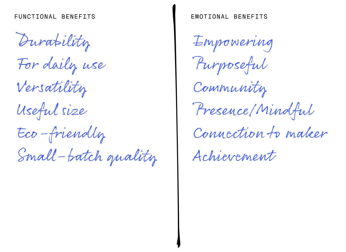 Emotional benefit: Why do you do it? This should cover why it matters to someone (beyond the functional benefits).